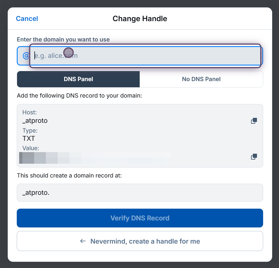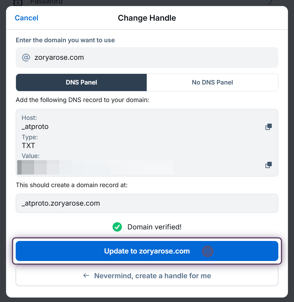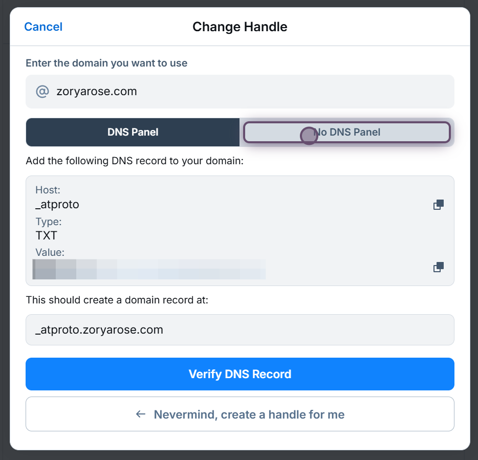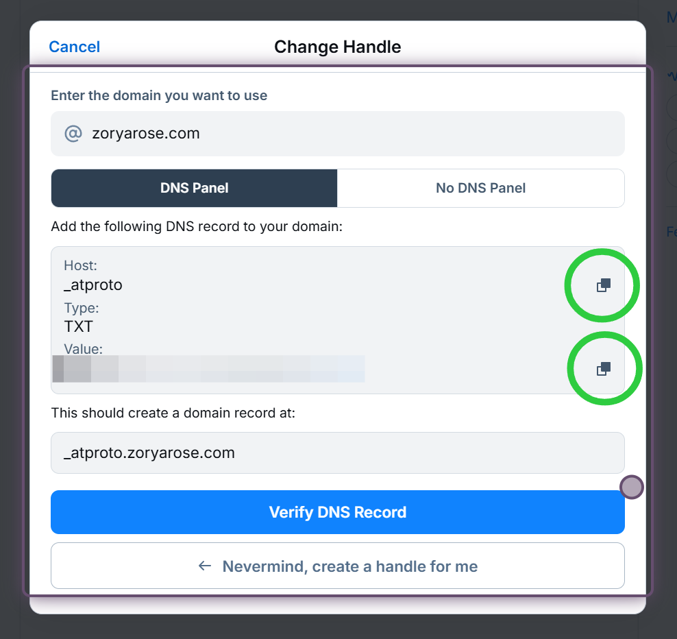 Copy the host (sometimes called name on your DNS provider) using the top copy button, then copy the value using the second copy button. Create the TXT record, then, after waiting a few minutes for it to propagate, click the **Verify DNS Record** button.